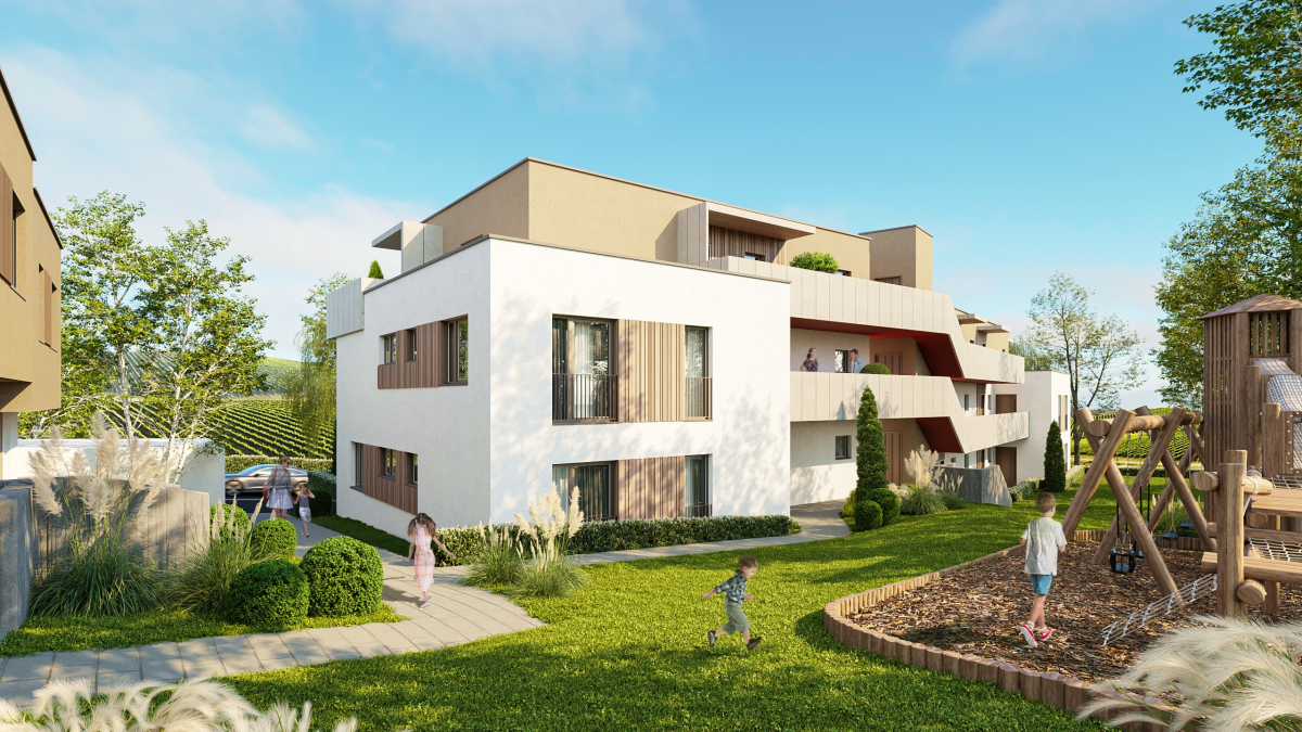 Kinderwägen. In den oberirdischen Geschoßen befinden sich die 13 Wohneinheiten,