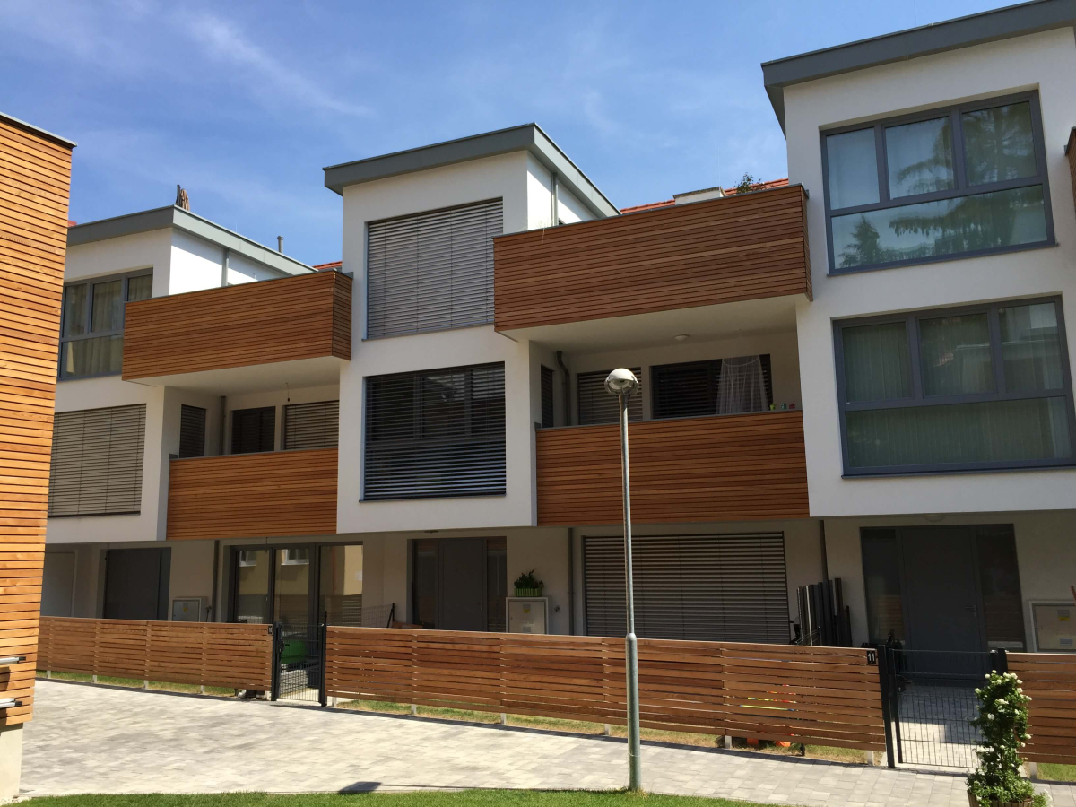 Im Hof wurden 5 neue Häuser errichtet, welche alle nach Südwesten orientiert sind, und große Fensterflächen erhalten, wodurch helle lichtdurchflutete Räume entstanden sind.