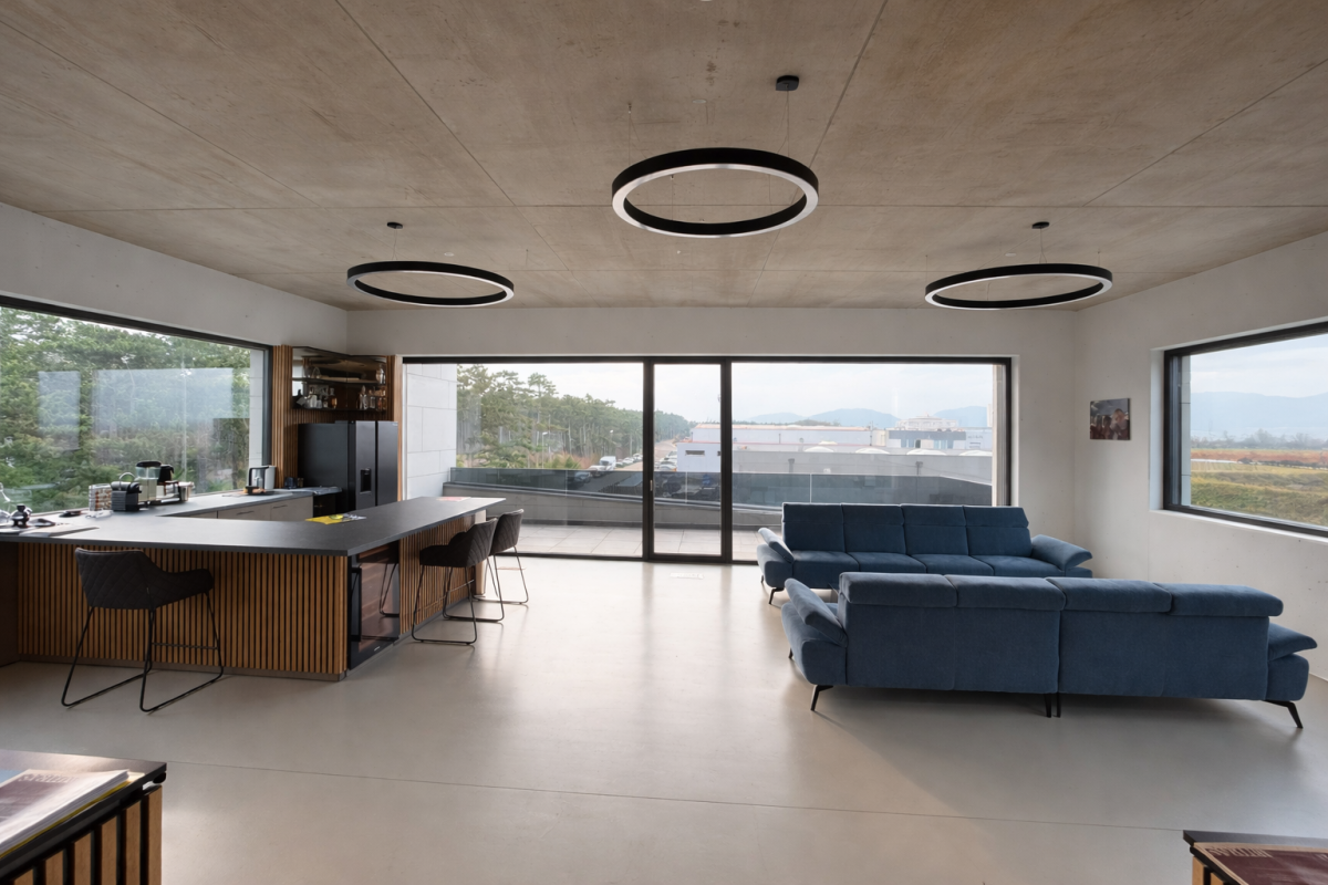 Sichtbeton weiß gemalt, und Holz Eiche weiß geölt, sodass die klare Architektur