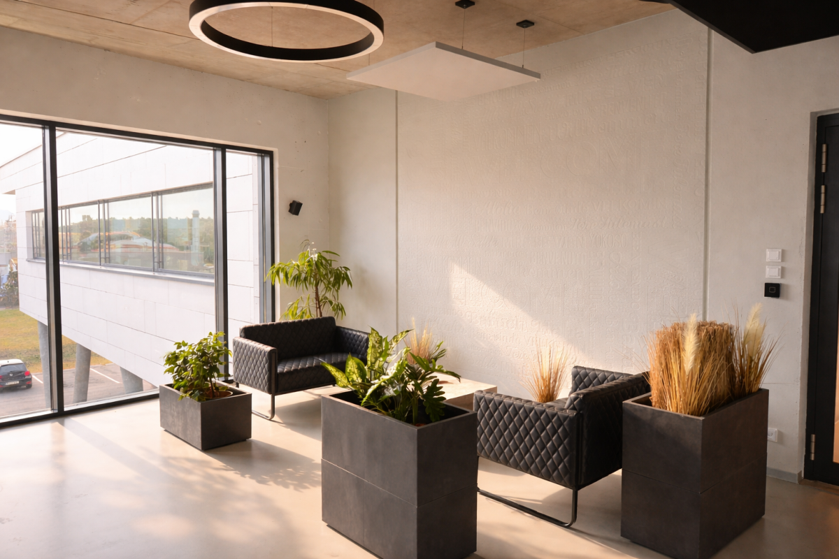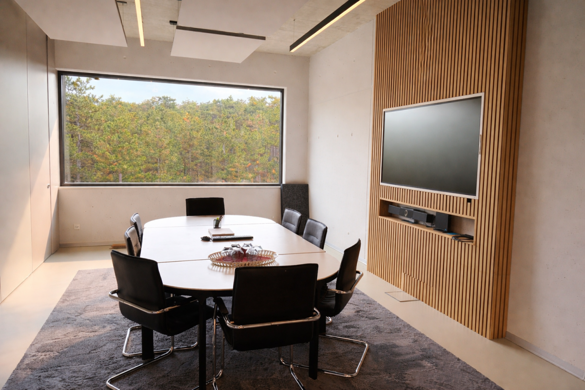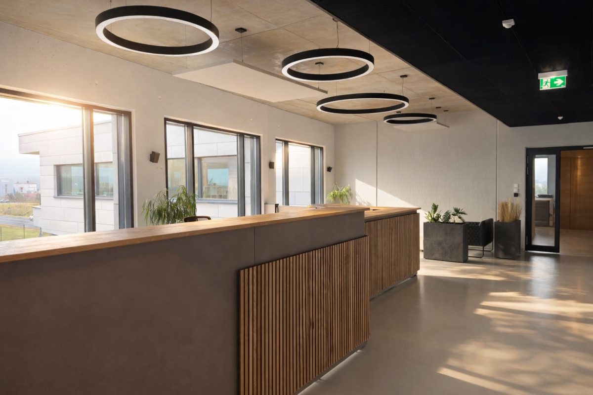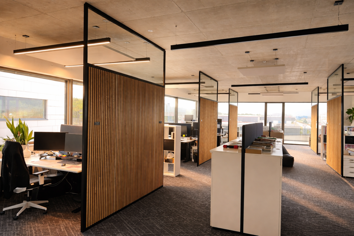 Deckenelemente und schallschluckende Raumteiler optimiert.