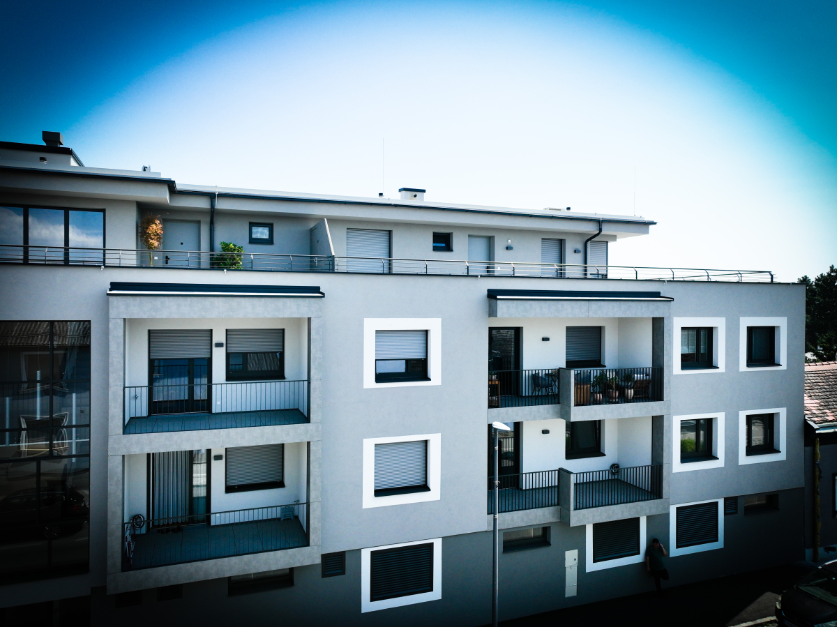 Das 3. Obergeschoß ist markant zurückgesetzt wodurch sich großzügige Dachterrassenflächen ergeben. Die 4 Wohneinheiten werden über das zentrale Stiegenhaus und über einen anschließenden Außengang erschlossen.