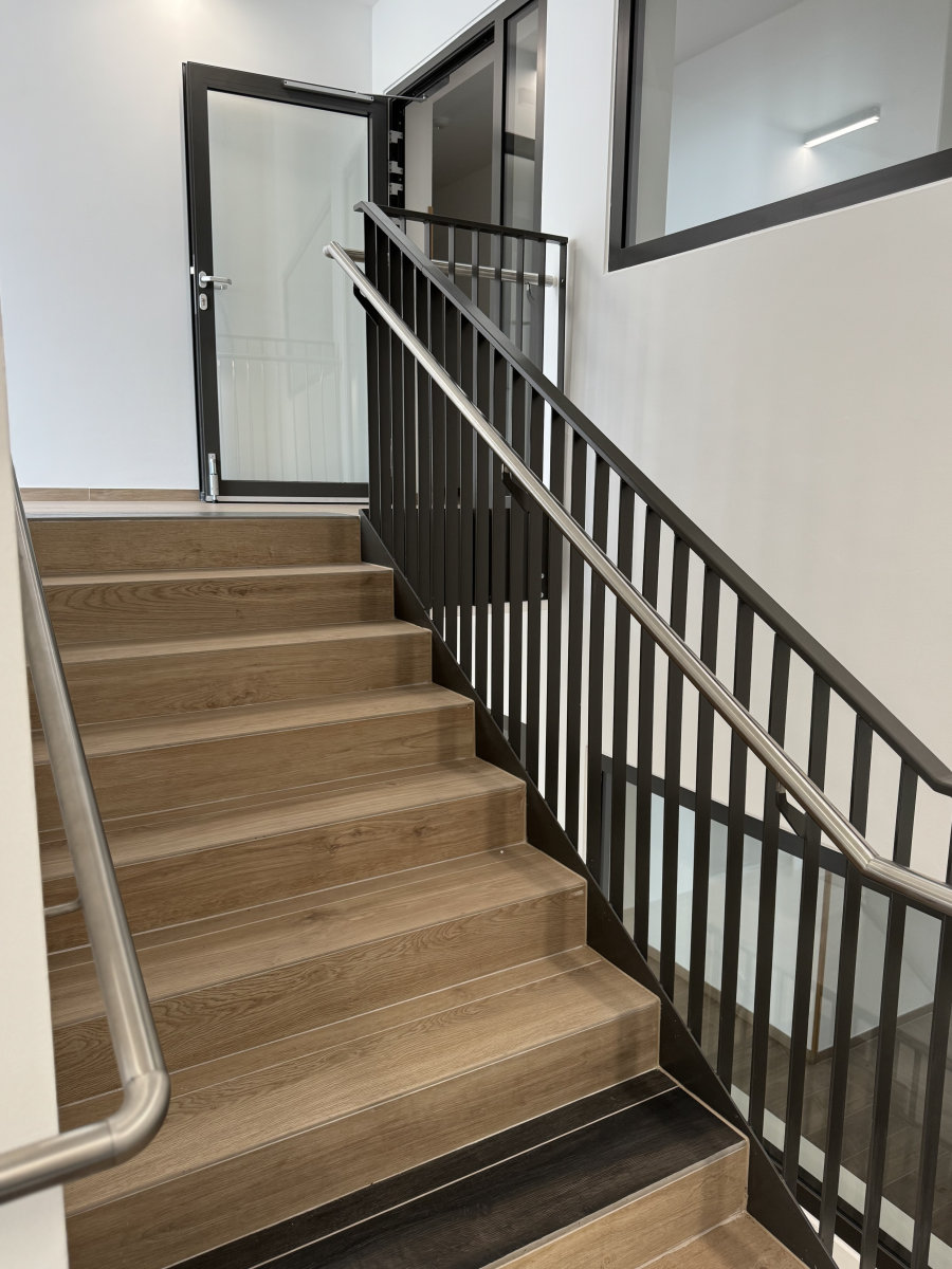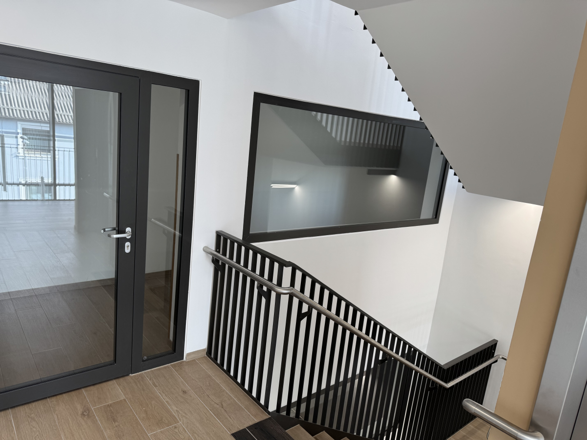 Der großzügig verglaste Haupteingang ist im Geäude mittig situiert und bietet mit seinem zentralen Stiegenhaus und barrierefreien Aufzug die Haupterschließung aller Geschoße.